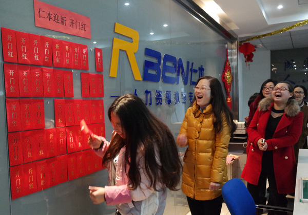2015年2月25日,是仁本人力資源公司春節后上班的第一天,也是公司傳統迎新“開門”發紅包的日子。與以往不同的是這個開門紅紅包中的金額有高有低,就看個人手氣。雖然外面下著小雨,刮著寒風,但公司里面到處洋溢著熱情、歡樂的氣氛;雖然紅包里的數額不一,但開心的笑容綻放在每個人的臉上。