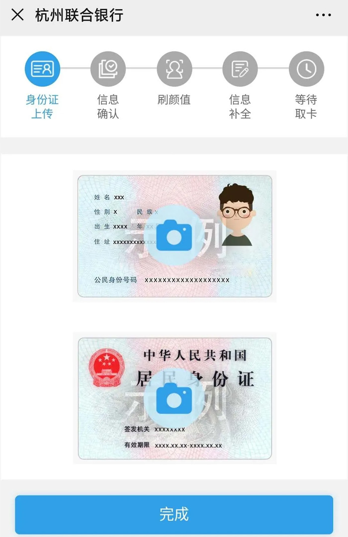 此二維碼由杭州聯合銀行提供,安全可靠, 信息只有銀行系統(tǒng)可以看到,請大家放心掃碼! 02、上傳身份證,完成人臉識別確認身份