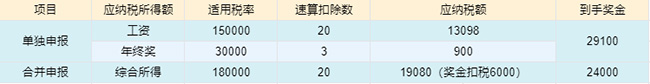 原理上來說,就是兩種計稅方式,產生了一些差異,導致需納稅金額不同。 那么年終獎單獨申報和并入綜合所得申報該如何選擇?哪個更節稅呢? 1、年終獎單獨申報 應納稅額=全年一次性獎金收入×適用稅率-速算扣除數 適用稅率:以全年一次性獎金收入除以12個月得到的數額對照月度稅率表確定: