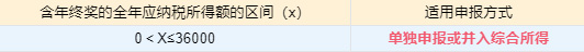 年終獎選擇兩種方式都可以。 (3)當年收入(含年終獎)減去6萬及三險一金、附加扣除等后應納稅所得額>36000 當含年終獎的全年應納稅所得額大于36000時,由于年終獎單獨申報存在雷區等原因,為使稅負最低,可在年終獎和工資之間進行分配,分配的年終獎按照全年一次性獎金單獨申報。