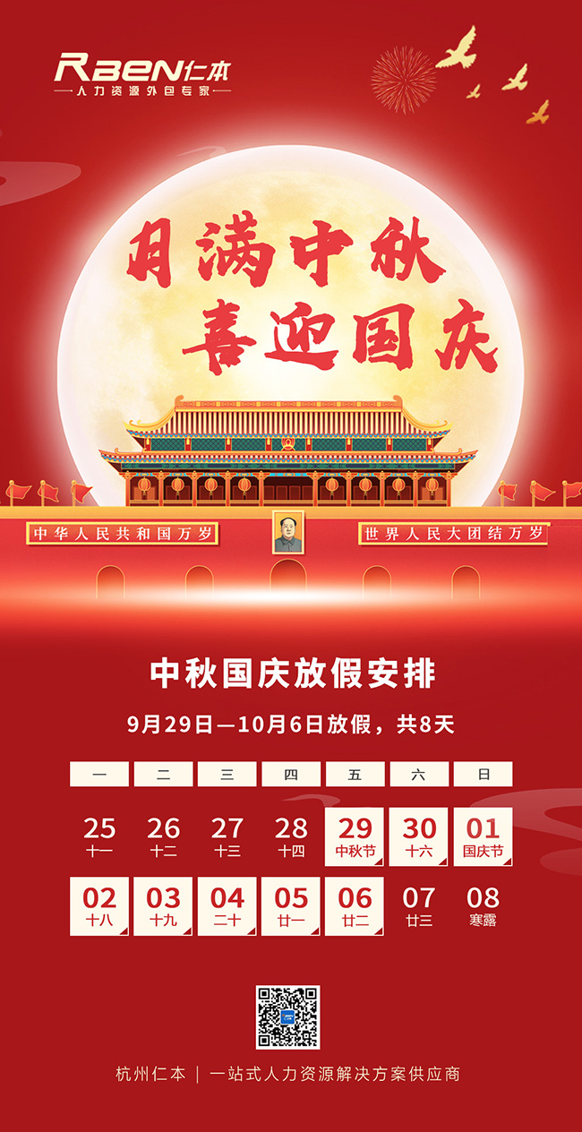 放假時間:9月29日至10月6日放假調(diào)休,共8天。10月7日(星期六)、10月8日(星期日)正常上班。