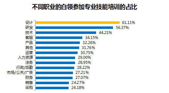 不過(guò),在一些企業(yè)中也有要求白領(lǐng)參加職業(yè)培訓(xùn)的,表現(xiàn)最為突出的是機(jī)關(guān)事業(yè)單位,達(dá)25.55%,私營(yíng)企業(yè)要求員工參加職業(yè)培訓(xùn)所占比重最少,僅17.16%。 調(diào)查顯示,白領(lǐng)參加過(guò)專業(yè)技能培訓(xùn)占比最多,達(dá)到34.92%,其次是資格證書(shū)培訓(xùn)占比31.48%,這與從業(yè)的崗位息息相關(guān),譬如財(cái)務(wù)、人力資源等;在練就硬實(shí)力的同時(shí)越來(lái)越多的人注重軟實(shí)力的培養(yǎng),管理能力培訓(xùn)就以15.9%的占比成為了職業(yè)培訓(xùn)中的參與率第三。