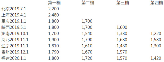 部分省市2019年月最低工資標準