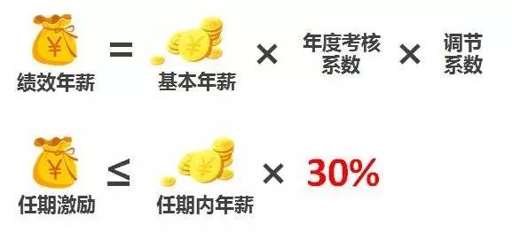績效年薪以基本年薪為基數,乘以年度考核系數(最高不超過2)、調節系數(最高不超過1.5)確定;任期激勵收入根據任期考核評價結果、在不超過任期內年薪總水平的30%以內確定。