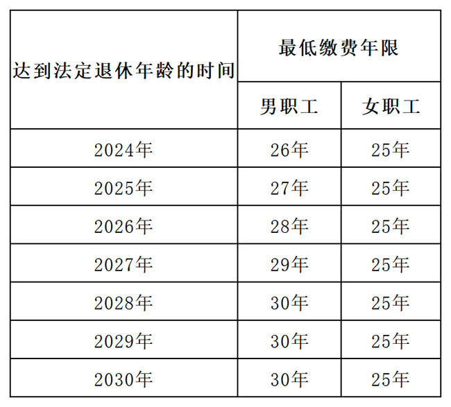 從2030年1月1日起,男職工為30年,女職工為25年。