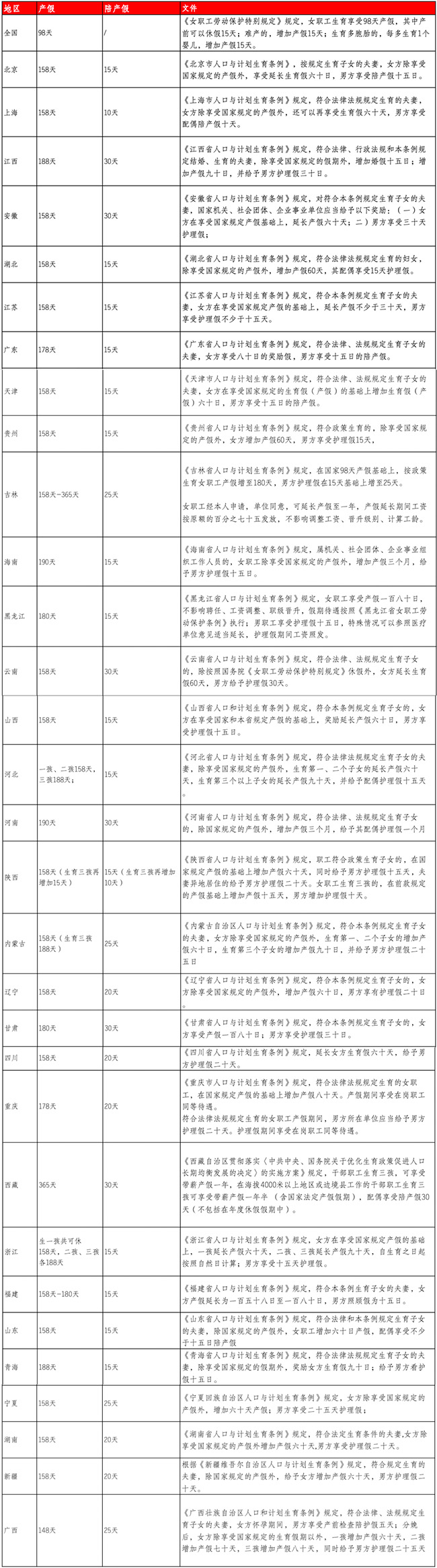 隨著各地計生條例的修改,產假有所延長,具體可查看下表