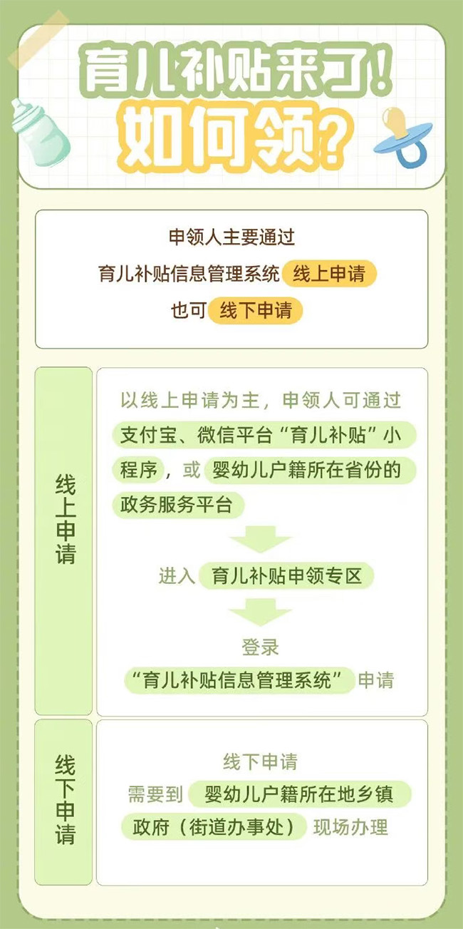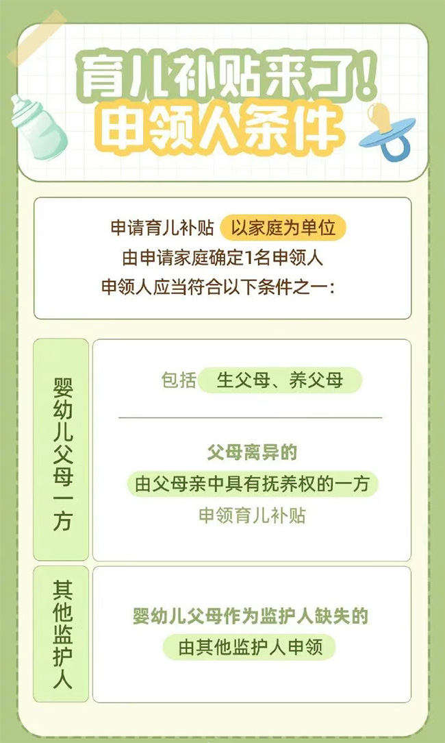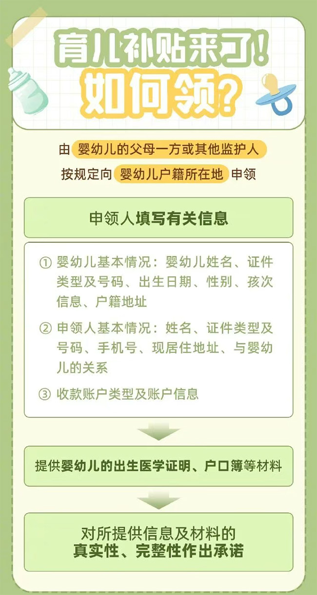 根據方案,從2025年1月1日起,對符合法律法規規定生育的3周歲以下嬰幼兒發放補貼,至其年滿3周歲。補貼對象應當具有中華人民共和國國籍。 換言之,2022年1月1日以后出生的嬰幼兒,無論一孩、二孩、三孩,均可申領育兒補貼。 育兒補貼按年發放,育兒補貼國家基礎標準為每孩每年3600元,至其年滿3周歲。 1.對于2025年1月1日及以后出生的嬰幼兒,可連續申領3年補貼,共計10800元。 2.對于2025年1月1日之前出生且未滿3周歲的嬰幼兒,可按應補貼月數折算補貼金額。 |